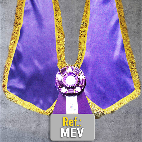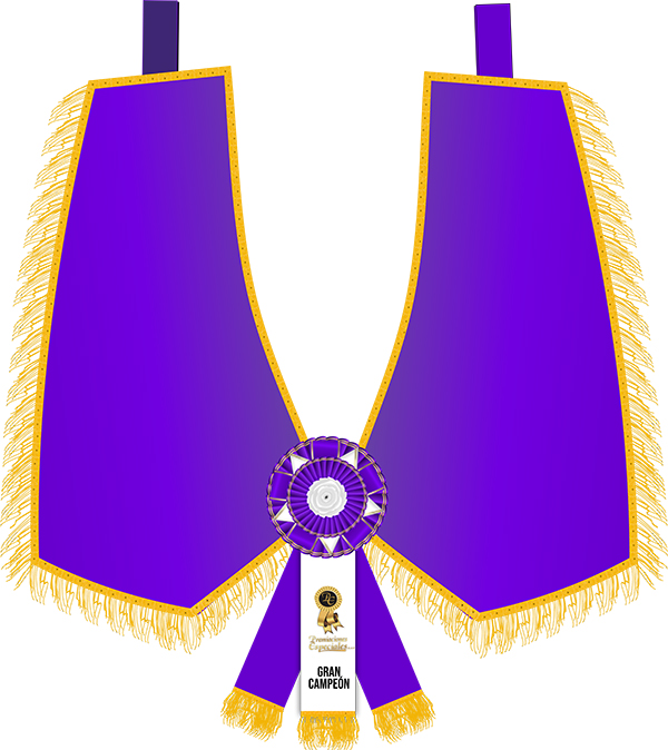 En la parte frontal, la manta integra una roseta de premiación con tonos violeta y blanco, acompañada de una estrella decorativa que realza aún más la jerarquía del reconocimiento. Los adornos utilizados complementan el conjunto visual y mantienen una armonía elegante que se adapta perfectamente a eventos de alto prestigio.