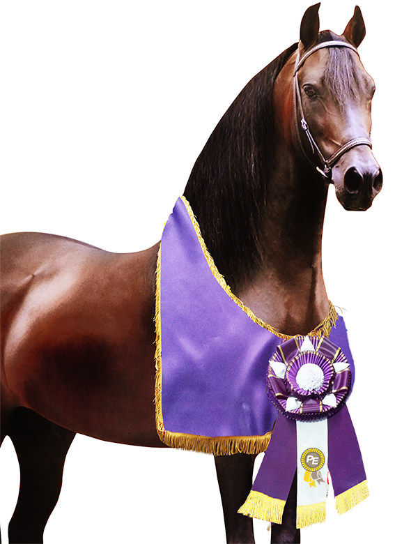 El satín violeta utilizado en esta manta aporta una textura suave, una caída impecable y un brillo atractivo apreciado en ambientes de exhibición. El borde dorado ó blanco en fleco añade un contraste llamativo que refuerza la estética del diseño y aporta movimiento natural durante el desplazamiento del ejemplar.