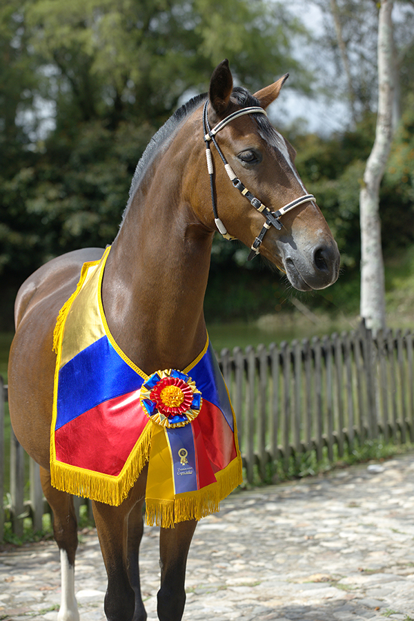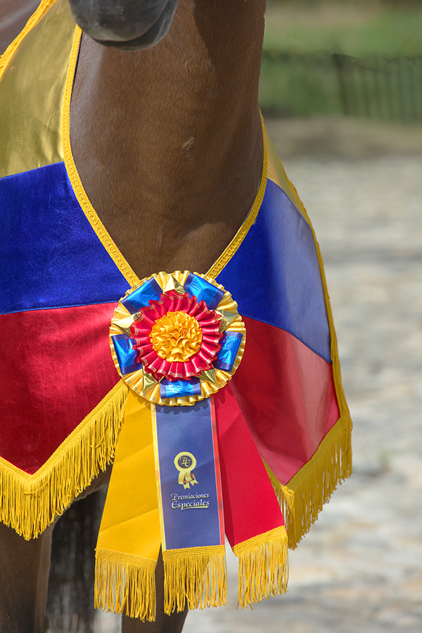 Las cintas de la roseta caen con elegancia y acompañan visualmente la energía del ejemplar durante su paso. Este elemento comunica de inmediato que el caballo ha alcanzado un nivel sobresaliente dentro de su competencia.