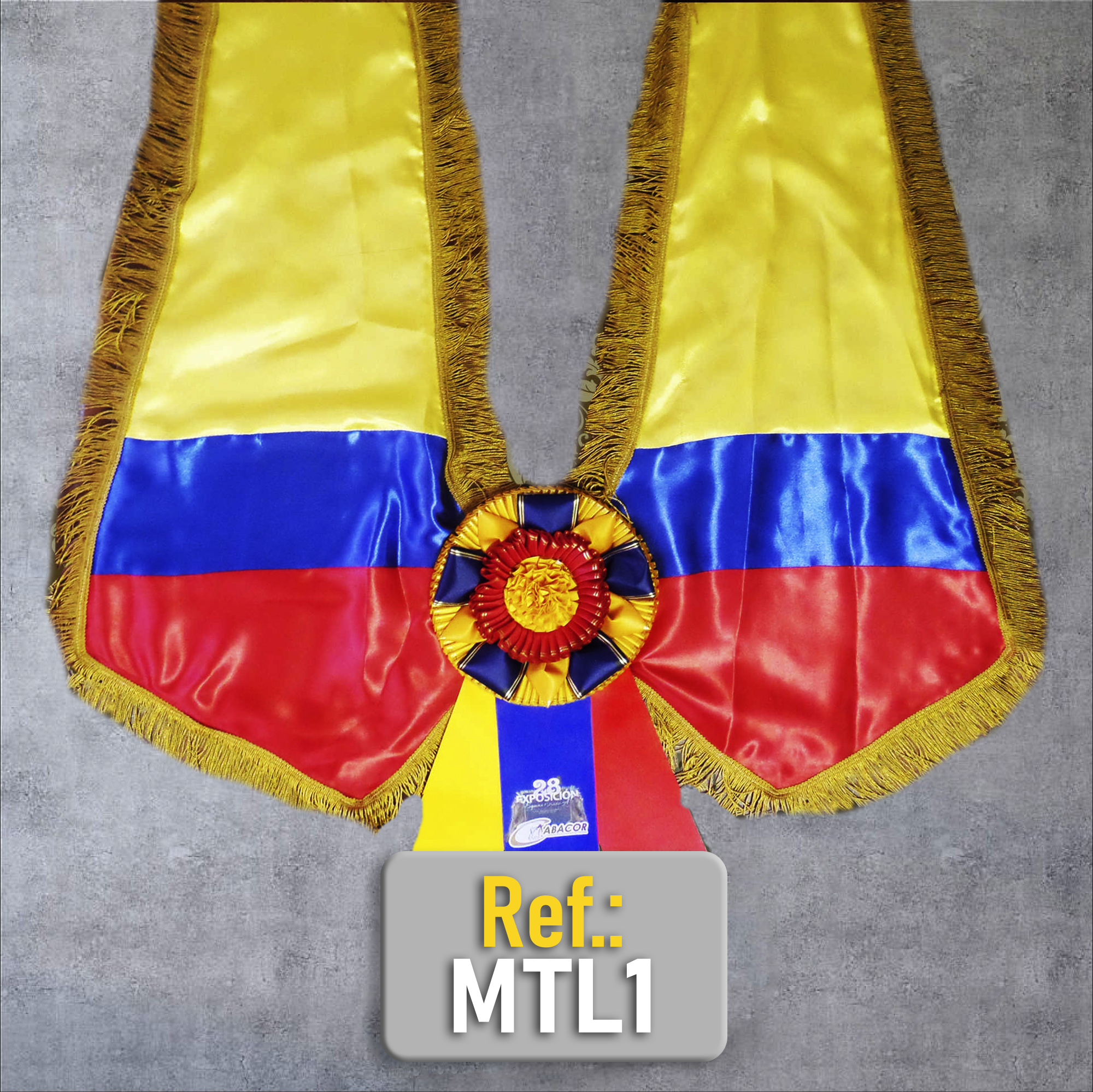La Manta en Satín Tricolor para Grandes Campeones Equinos destaca la elegancia y jerarquía del ejemplar durante las premiaciones más importantes. Su diseño en los colores de la bandera de Colombia —amarillo, azul y rojo— proyecta tradición, identidad y el prestigio asociado a los eventos equinos de alto nivel.