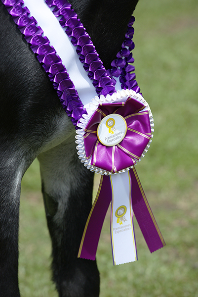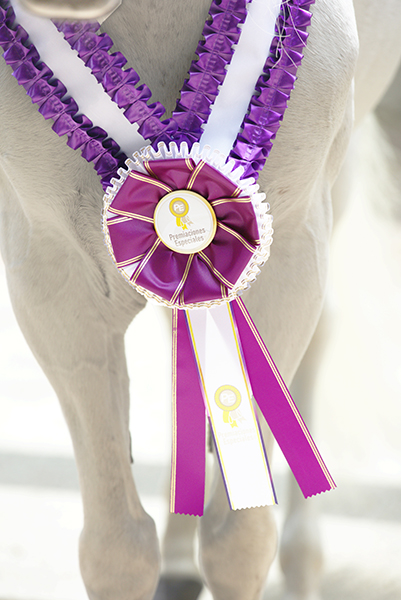 Las cintas decorativas de 20 cm completan el diseño. Estas cintas caen de manera natural y permiten incluir textos personalizados como “Campeón Joven con Paso”, o el nombre completo del certamen. De esta forma, cada evento puede entregar un pectoral único y totalmente alineado con su identidad visual.