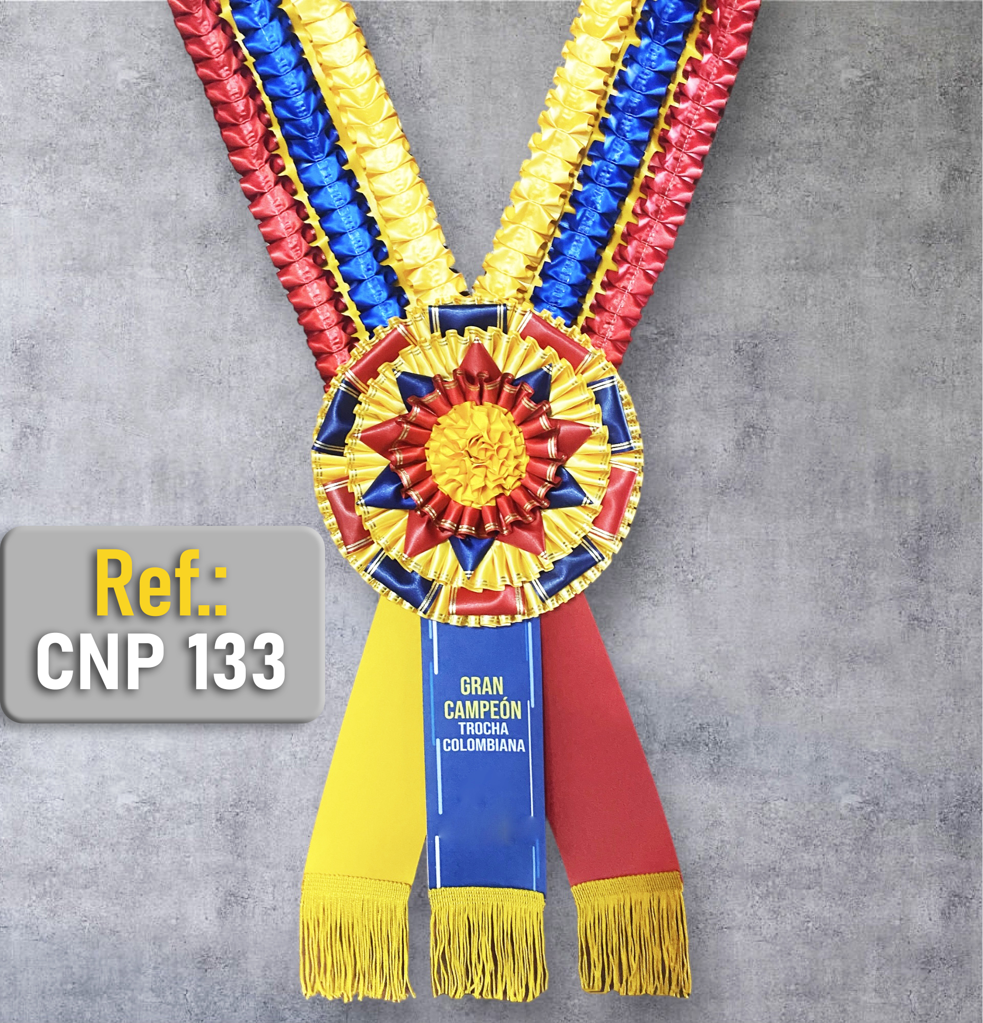 El Pectoral Superlujo CNP 133 destaca por su diseño imponente de tres rosetas, bandas plisadas y cintas decorativas, ideal para reconocer a Grandes Campeones y Reservados en competencias equinas. Su confección en satín de alta calidad permite un acabado elegante y llamativo. Perfecto para eventos oficiales, ferias y premiaciones de alto nivel.